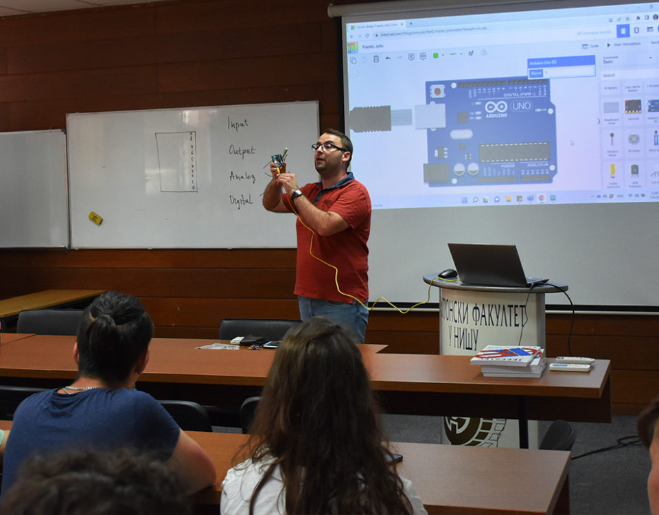 11.04.2022. On April 11, 2022, the Faculty of Electronic Engineering welcomed Ivana Bogdanović and Bojan Stanković, lecturers of ETS „Mija Stanimirović“ in Niš. The two-hour workshop focused on the use of the Arduino platform in practical classes. Miloš Marjanović and Nikola Mitrović were the workshop’s leaders. The workshop organizers are members of IEEE SB Niš. The goal of the course was to transfer the skills learned at the workshop to students during regular classes.