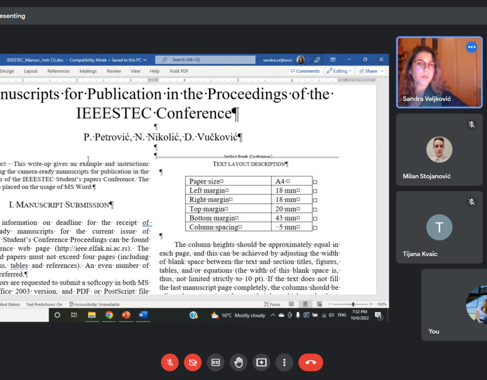 06.10.2022. The student organization EESTEC LC Niš, Electrical Engineering Sudents’ European association local committee Niš, organized an online meeting to inform some of their members about how to write a scientific paper. As the Conference was online for the last two years and part of the older students graduated from the faculty, they wanted to be more informed about the principles of writing papers and how and where to find topics they can write about. They were interested in finding out from which fields they can write papers, in which writing style the papers should be written. Also, they were interested in whether each paper should have a practical realization and what are the criteria for the awards received at the Conference. In addition to information about the Conference, they were very interested in hearing more about the IEEE society, how numerous the membership is, what are the areas of activity and what engagement within the society looks like. Sandra Veljković held the meeting in front of the organizing committee of the Conference.