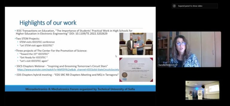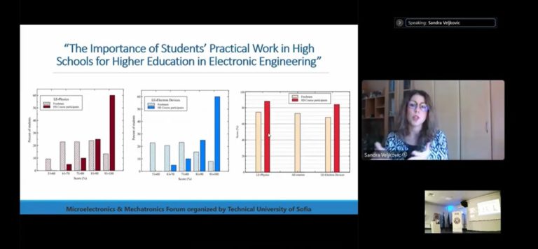 07.10.2022. On Friday, October 7, the Technical University of Sofia organized a Microelectronics & Mechatronics Forum. During that event, the Department of Microelectronics received an invitation to participate. A paper titled The Importance of Higher Education in Electronic Engineering was presented in the panel: Education & Research. As part of the presentation, a paper published in IEEE Transactions on Education, „The Importance of Students’ Practical Work in High Schools for Higher Education in Electronic Engineering“, was presented. Sandra Veljković attended and participated in the Forum.